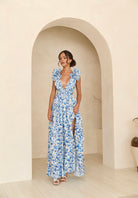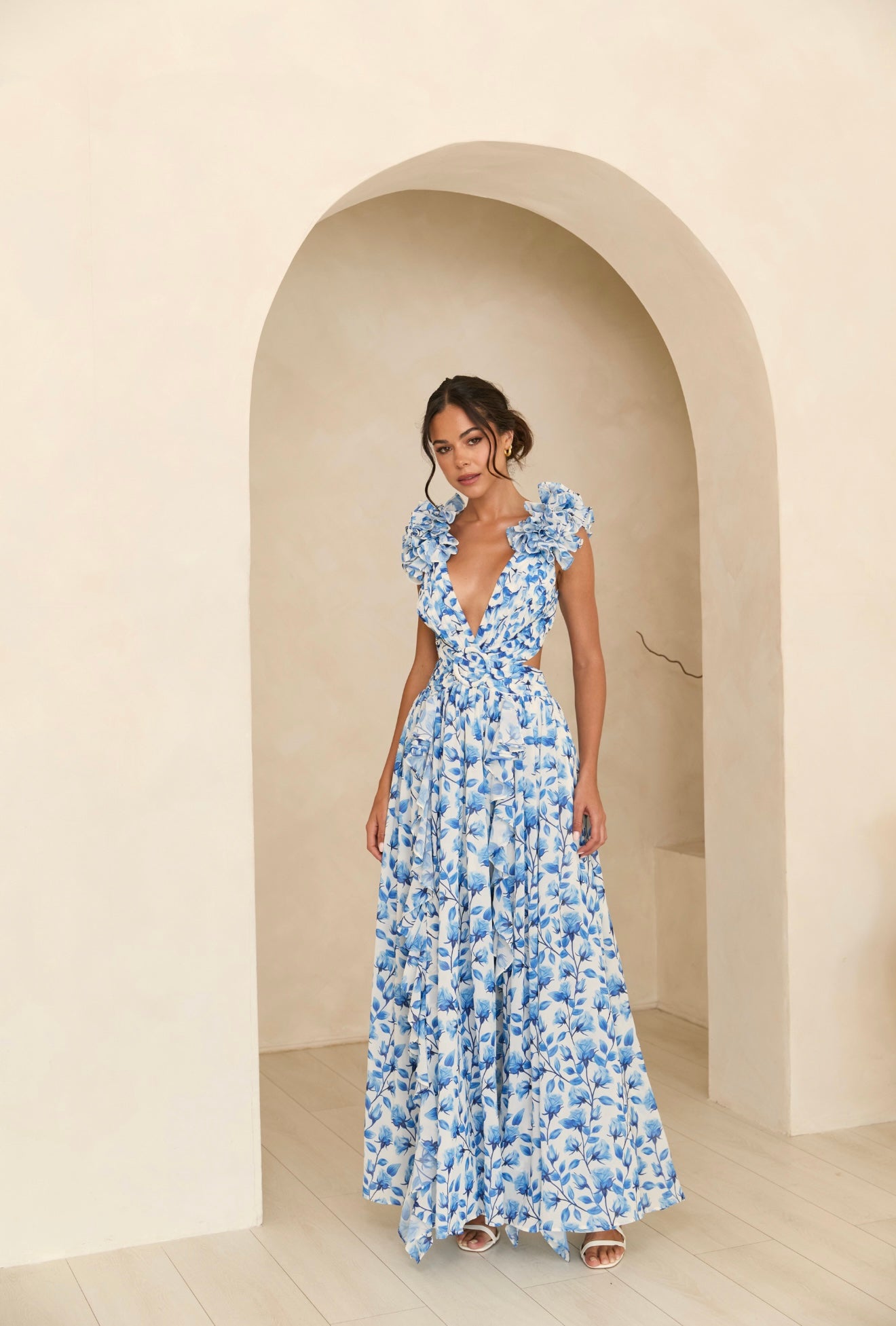 Floor-sweeping maxi dress made from a lightweight chiffon fabric. Voluminous flutter sleeve made from layers of ruffles. Cutouts at the side that are strategically placed at the smallest part of your waist to flatter your figure. Fabric-covered buckle at the centre in shape of a circle. Laceup tie back closure. Lined half way for a sheer effect at the bottom.