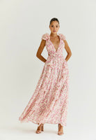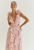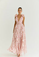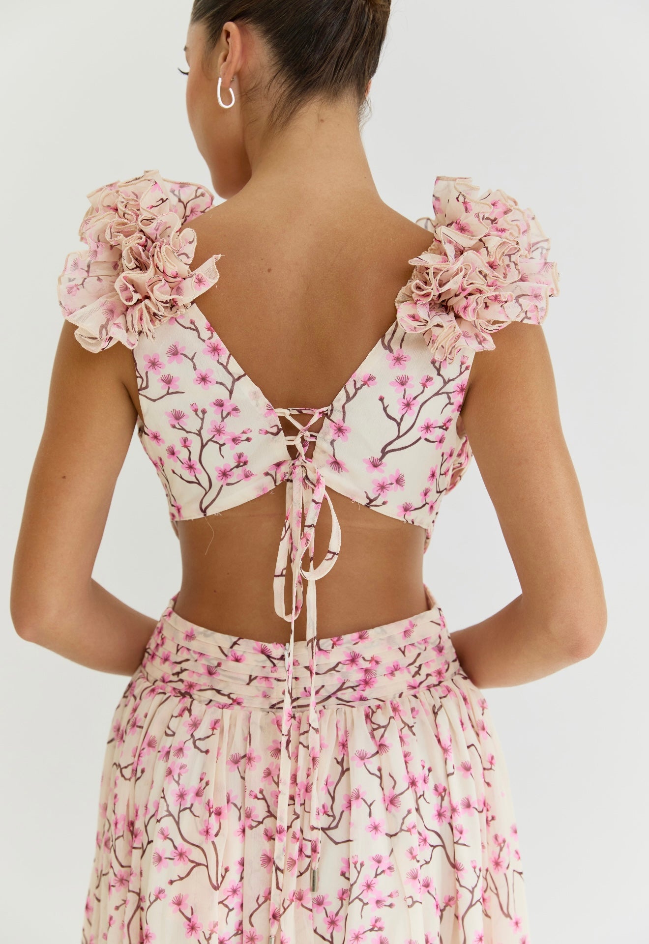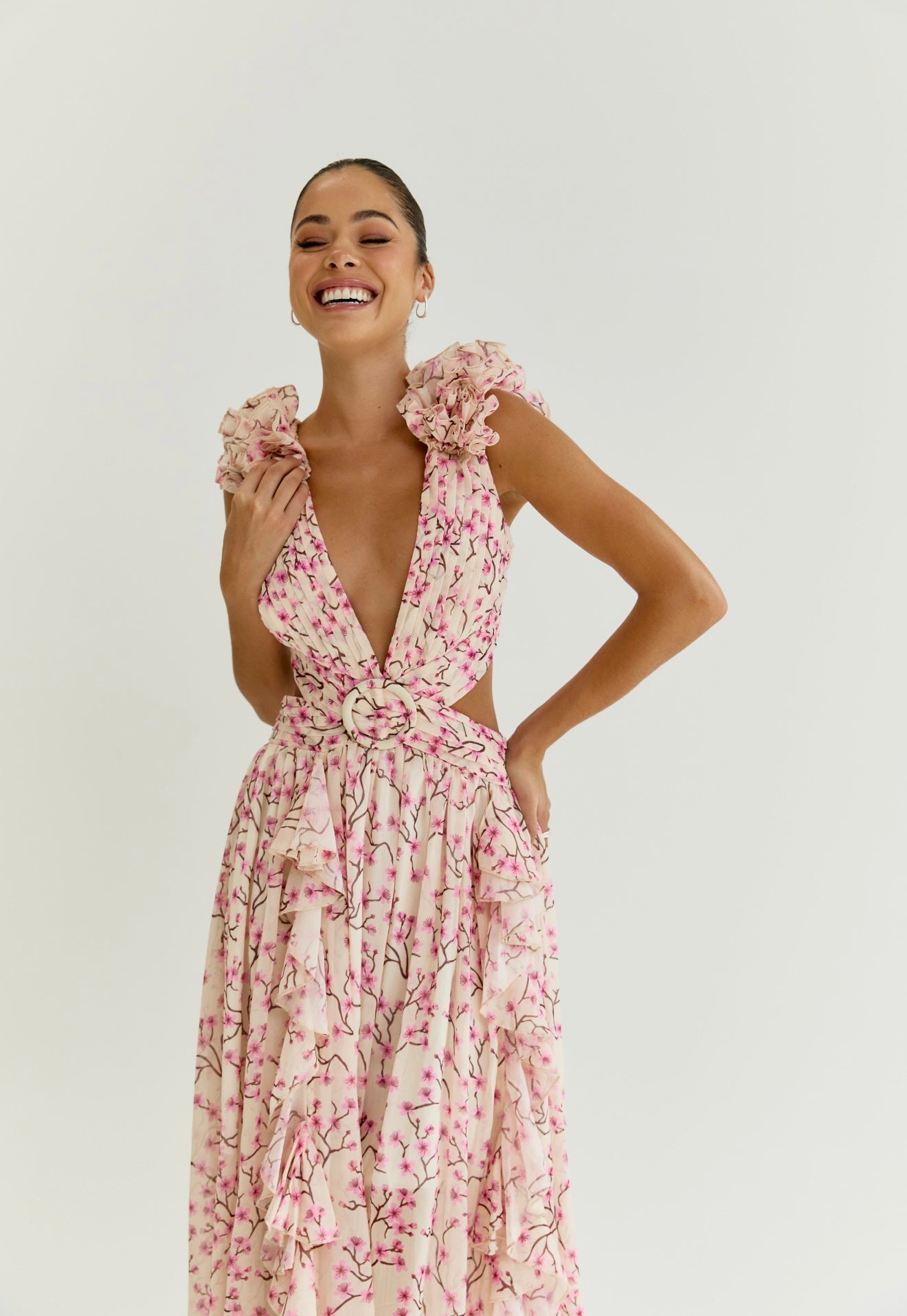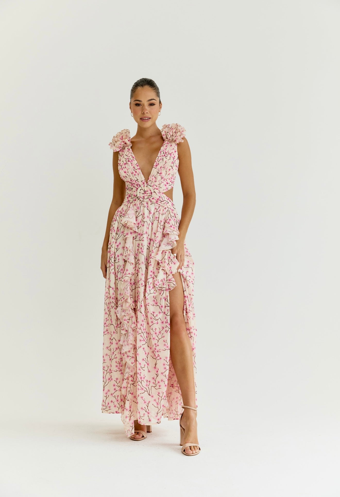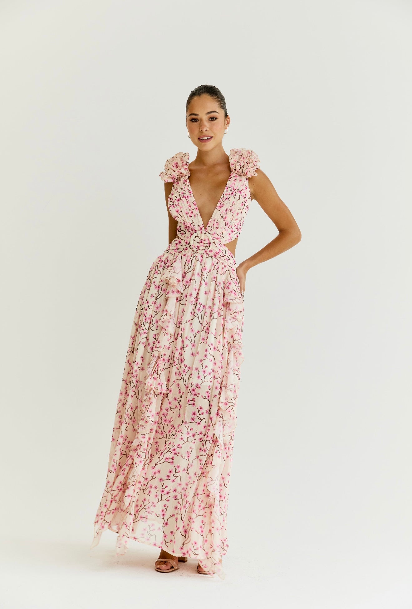 Floor-sweeping maxi dress made from a lightweight chiffon fabric. Voluminous flutter sleeve made from layers of ruffles. Cutouts at the side that are strategically placed at the smallest part of your waist to flatter your figure. Fabric-covered buckle at the centre in shape of a circle. Laceup tie back closure. Lined half way for a sheer effect at the bottom.