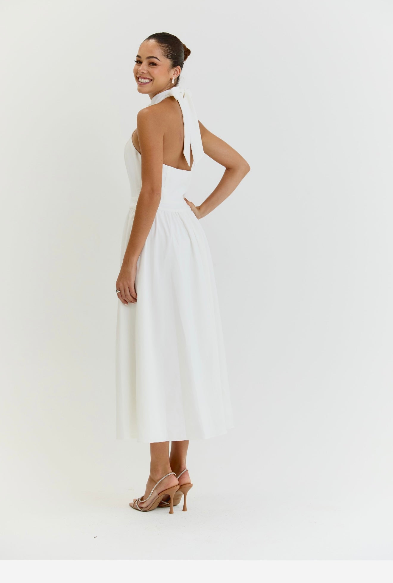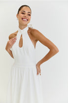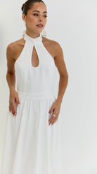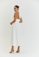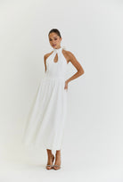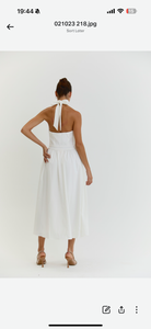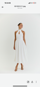 Introducing The Harper Dress, a stunning and elegant white midi dress perfect perfect for all occasions. With its graceful halter neck and low back, this dress exudes timeless sophistication and grace, making it the must have choice for any event whether it be Wimbledon to Ascot or a garden party. Perfect for strolling around city streets with trainers or dressing up for a evening with heels. Its versatility and effortless style will make you stand out in any setting.