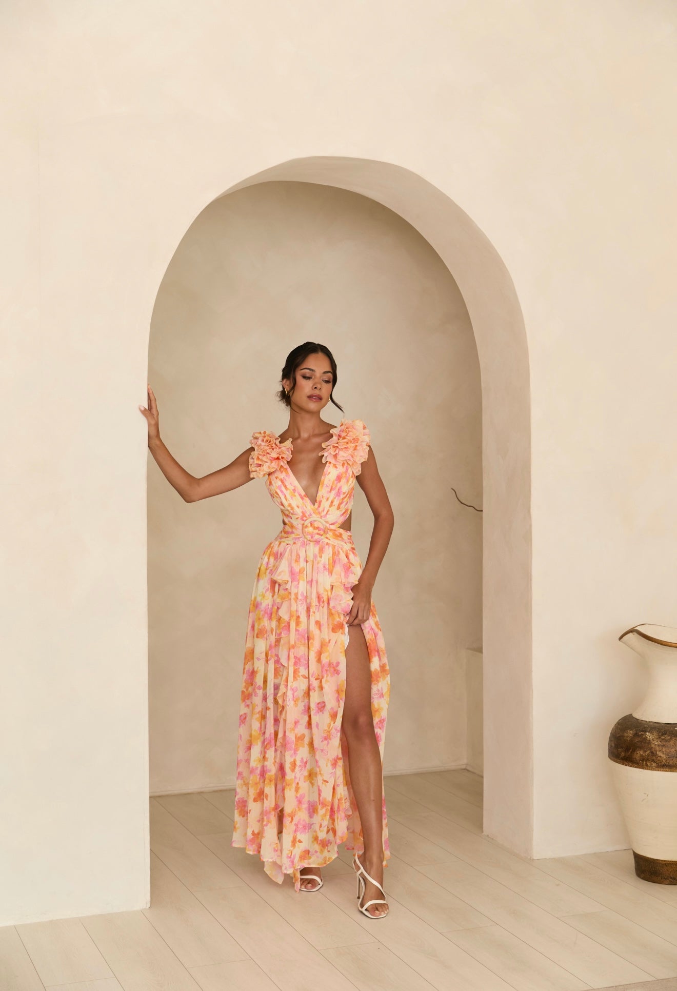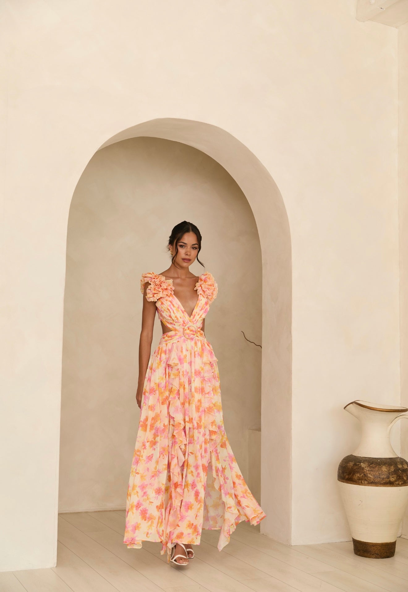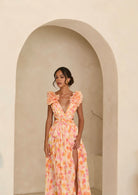 Exude elegance with the Clementine Floral Maxi Dress. Crafted from vibrant floral fabric, this show-stopping maxi cascades in delightful waves of color as bright as fresh-pressed clementines. Feature your figure with a cutout detail, then finish this masterpiece with a delicate lace-up detail along the back. A stunning best-seller in a bold new colour palette, this dress is sure to turn heads.