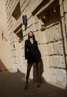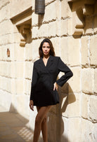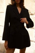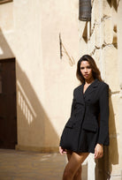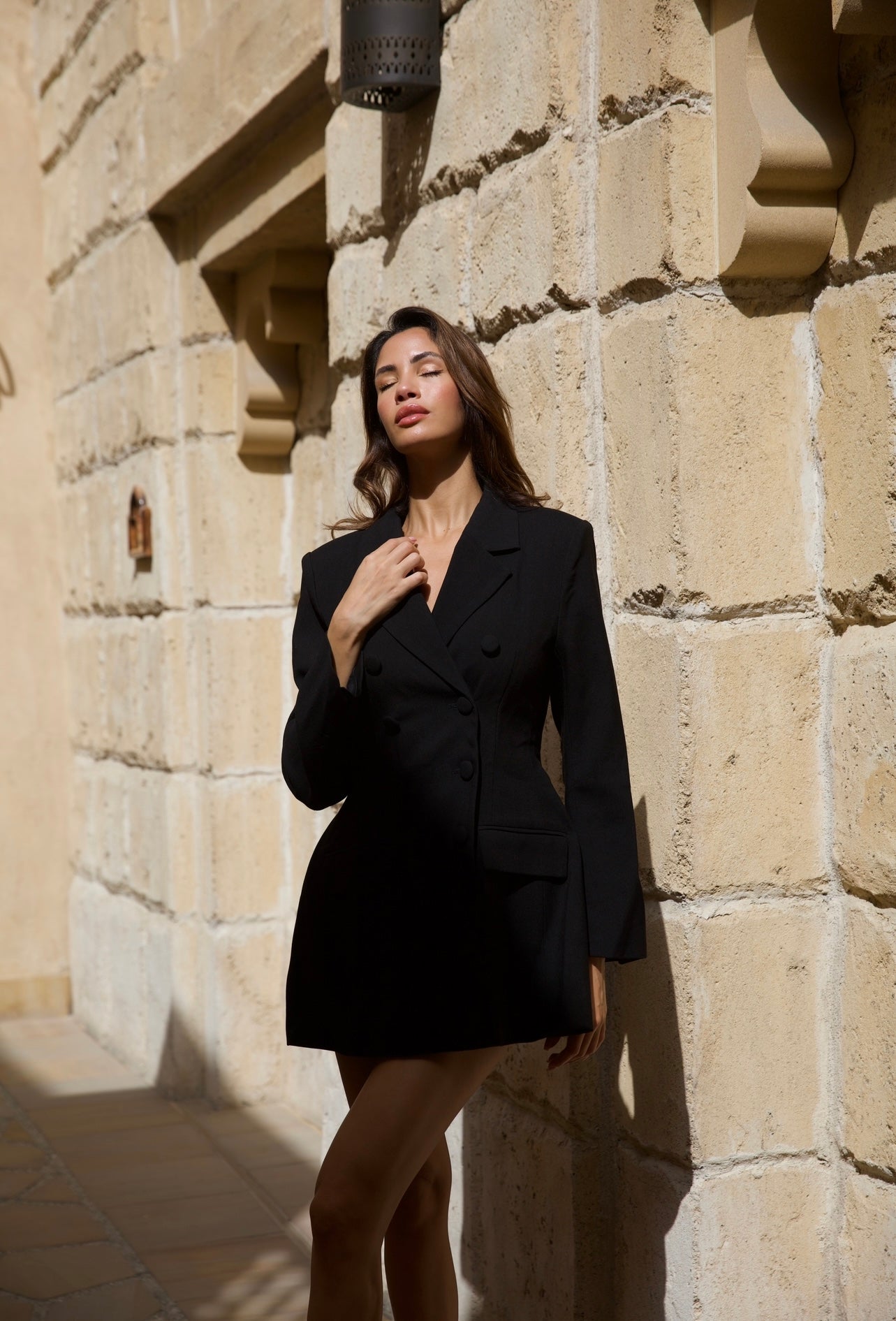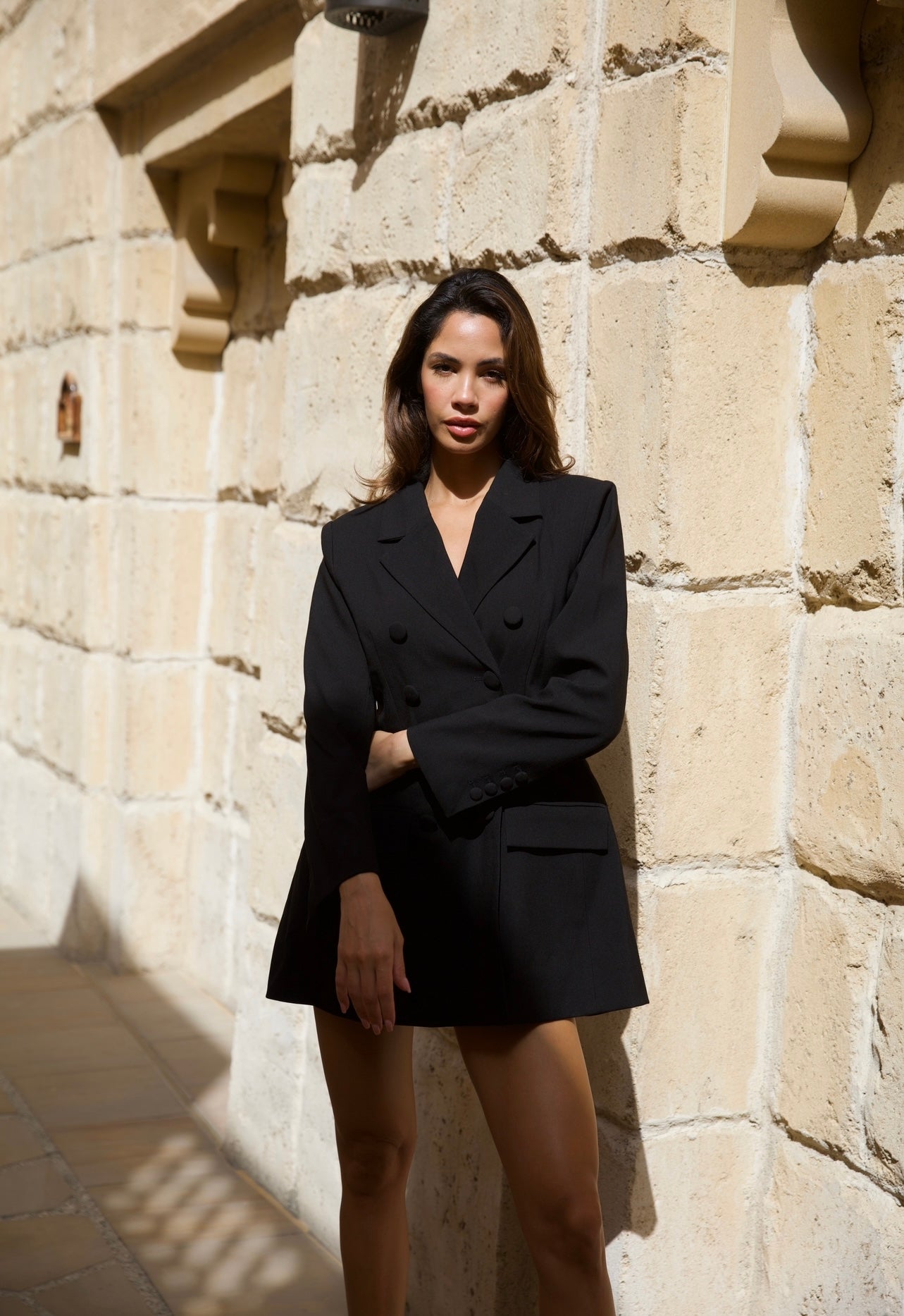 Indulge in luxury with the Beaute Blazer Dress from the 1ERA Collection. This suiting fabrication was made for your forever wardrobes, offering an elegant fit and exquisite button detailing. Elevate your style with this timeless piece that will make a lasting impression. Wear multiple ways. Style as a dress or wear as a blazer.
