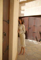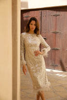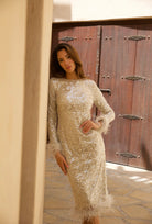 This exquisite sequin dress is perfect for making a statement. Crafted in a luxurious champagne hue with a dramatic backless design and soft feather trim, it is sure to captivate. Step into the spotlight and embrace your inner glamour.