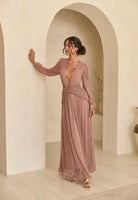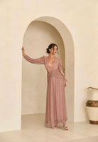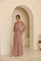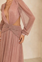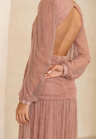 Indulge in the opulence of The Goddess Pink Dress. This exquisite dress boasts a goddess pink hue with subtle hints of gold. The sheer sleeves add a touch of elegance while the cut out design and flowy skirt create a stunning silhouette. It is lined. With a backless style and intricate button and zip details, this dress is truly a work of art. Beautifully Lined.